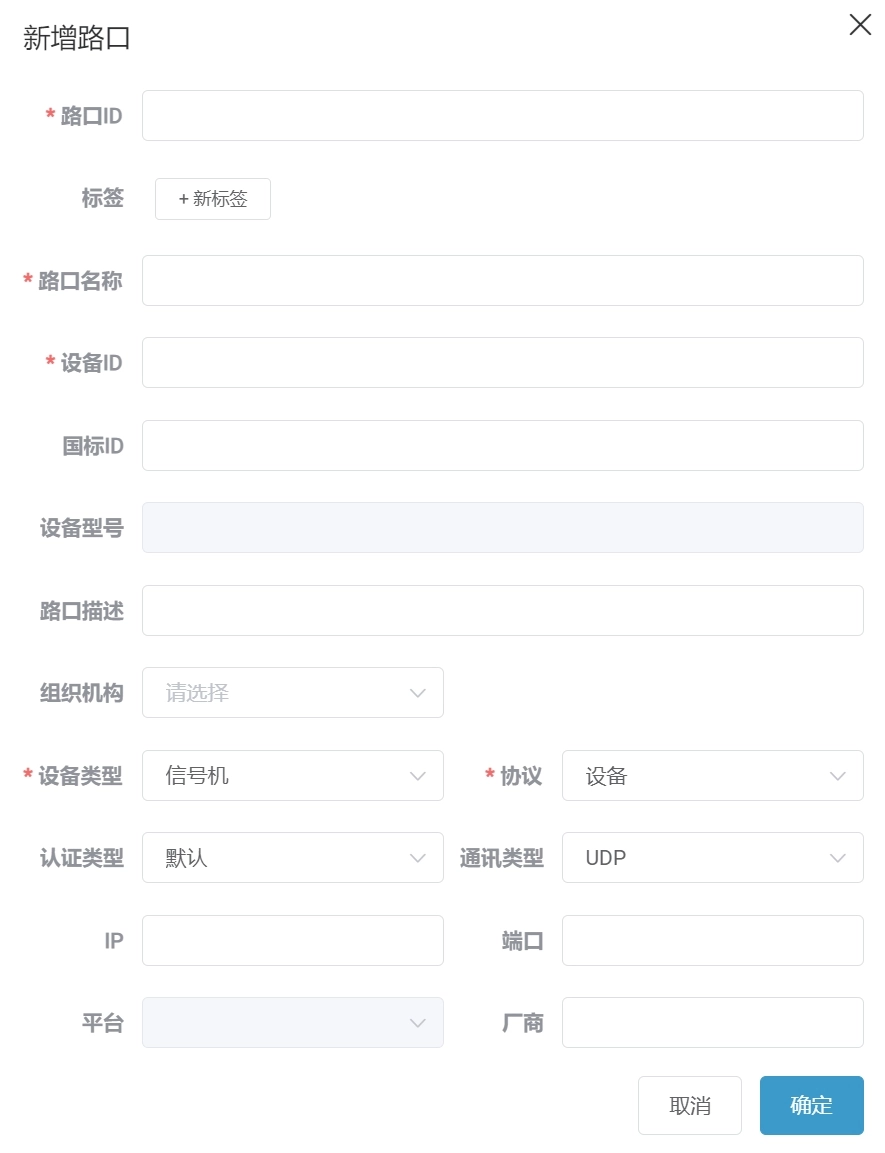 在路口管理主页面点击“新增”按钮,弹出新增路口对话框。需要填写路口ID、路口名称、设备ID、设备类型(信号机/第三方设备/虚拟信号机)、协议(平台/设备/级联)、认证类型(默认/V1/V2/V3)、通讯类型(UDP/TCP)、IP(当前运行的本机IP)、端口(端口号为设备配的端口号,若设备修改则对应的端口号也需更改)。其中,路口名称为设备所在路口的描述,设备类型默认选择“信号机”,协议默认选择“设备”,认证类型默认选择“默认”,通讯类型默认选择“UDP”,填写完设备各参数后,点击“确定”,列表中会新增一条路口信息。