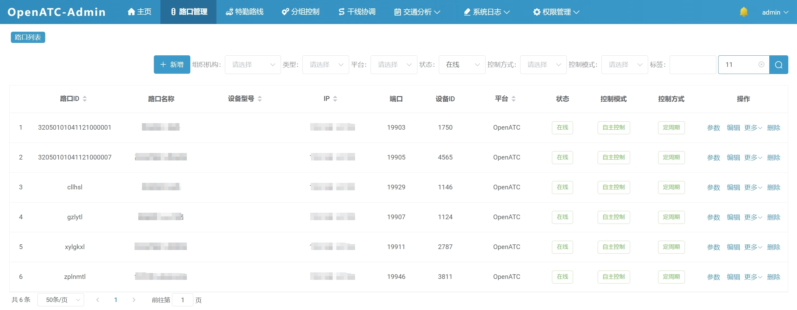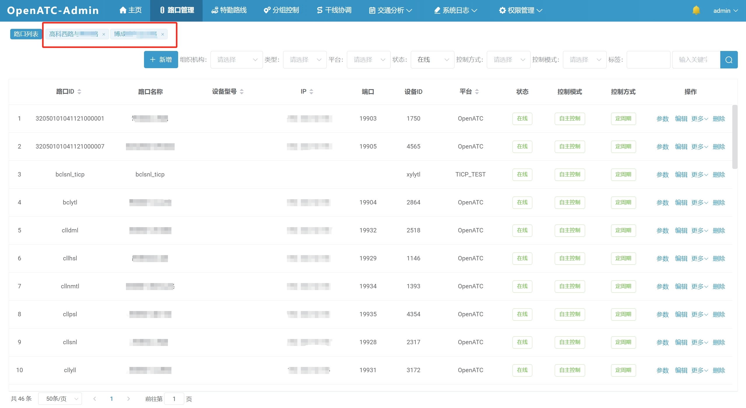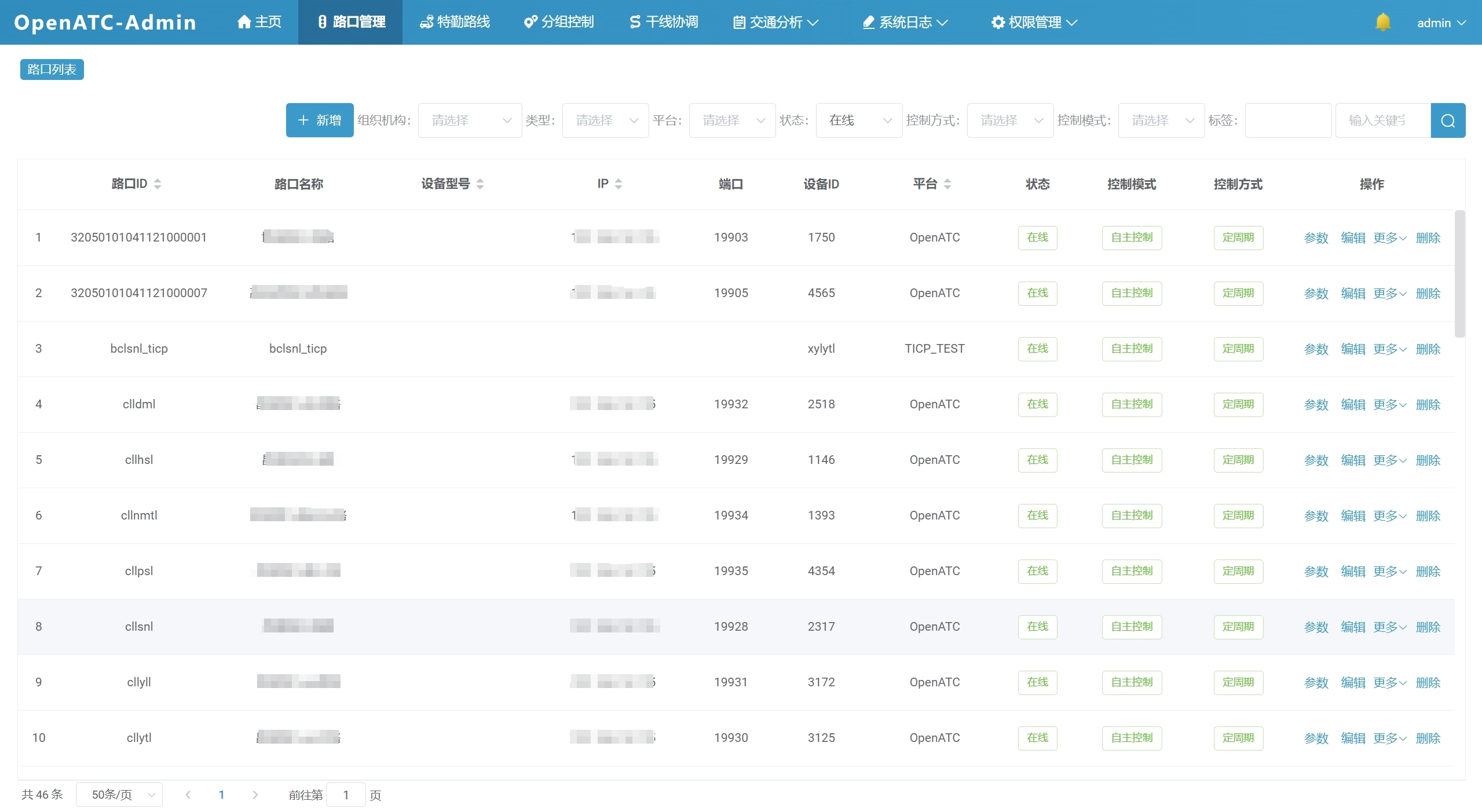 点击菜单栏“路口管理”,进入路口管理界面,tab栏可以打开多个设备,当前界面展示了路口ID、路口名称、IP、端口等信息,可以进行设备的添加、修改、删除、搜索、故障信息查看以及状态监视、控制等功能。路口管理是OpenATC的核心功能模块。可根据各路口所属的类型、平台、状态、控制方式和控制模式等进行筛选查看。