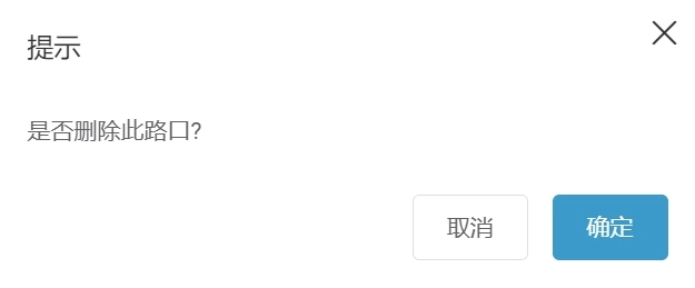 在路口管理主页面点击“删除”按钮,弹出“提示”对话框,显示“是否确认删除此路口”,点击“确定”,列表中对应路口则被删除。