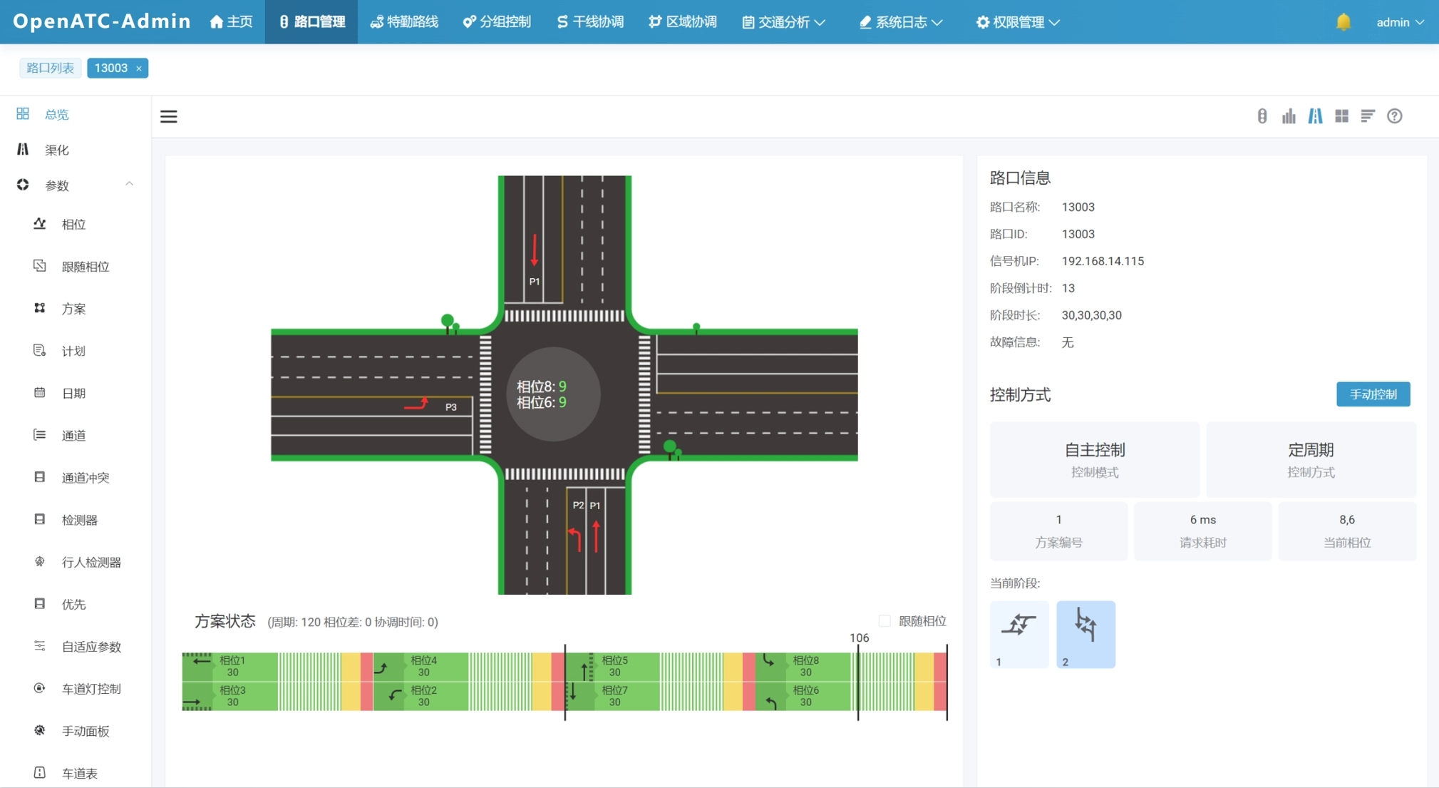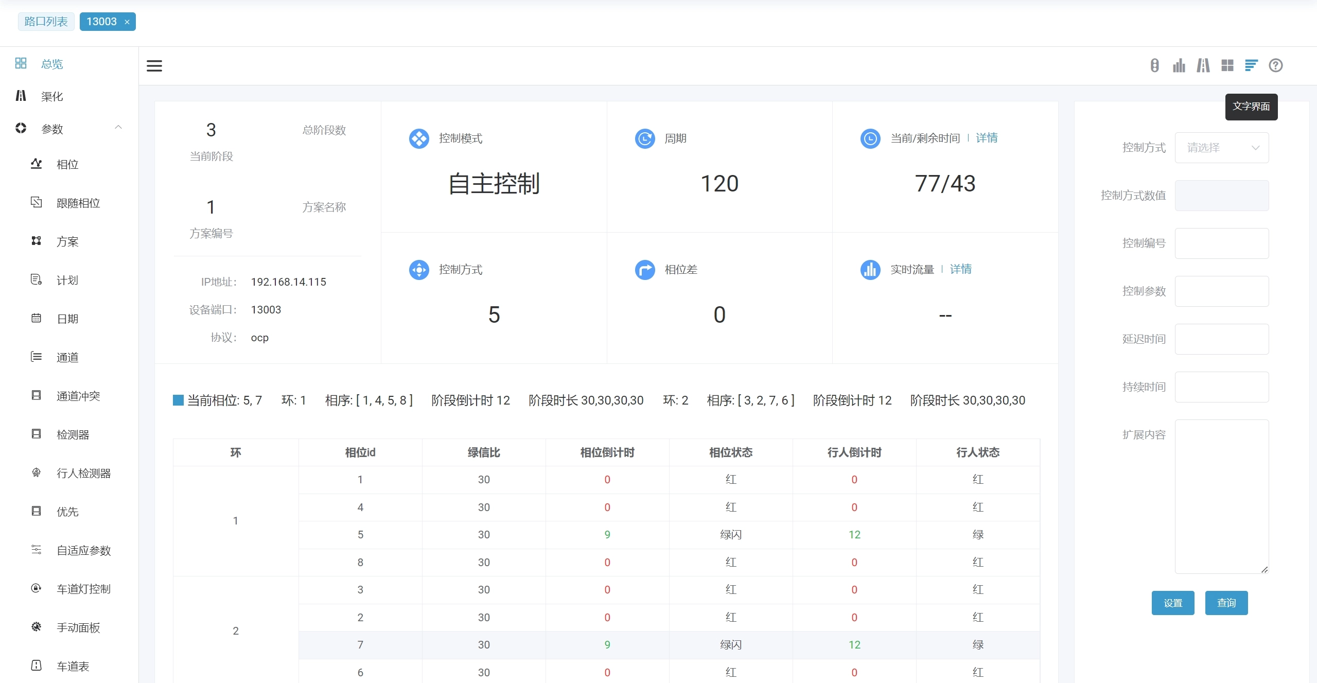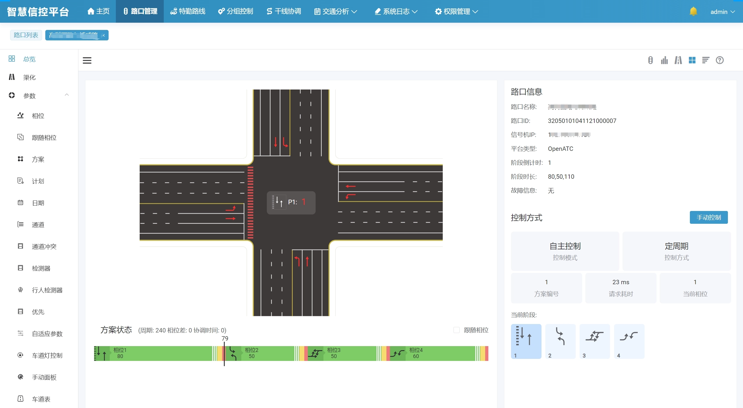 点击“操作-参数”,跳转至设备参数详情界面,该界面显示了当前路口实时信号分布状态,右侧工具栏主要显示该设备所在路口名称、路口ID、信号机IP、平台类型、阶段倒计时、阶段时长和故障信息,并显示当前设备的控制方式和当前阶段,可勾选查看方案状态部分右上角的“跟随相位”。