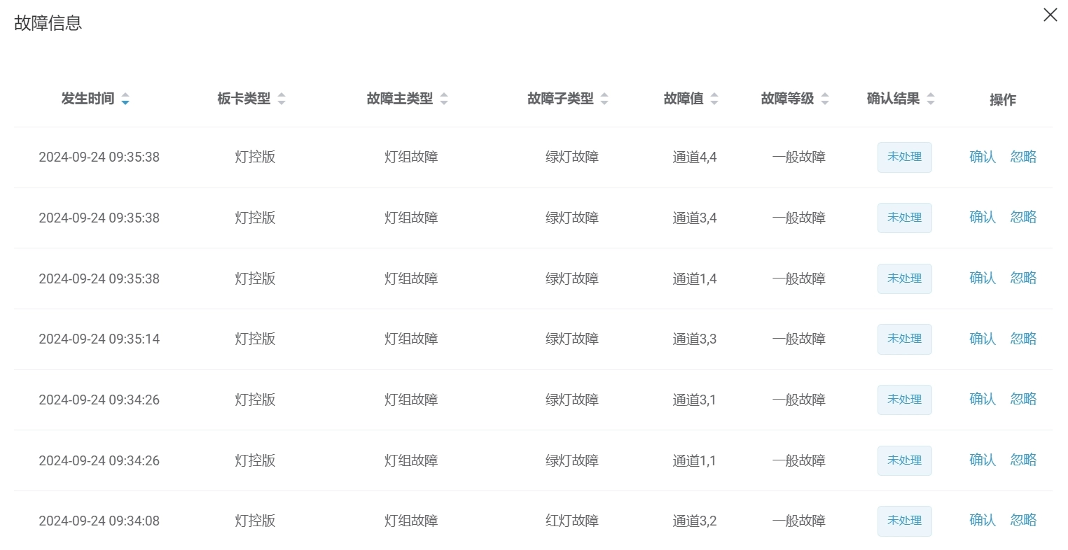 点击“忽略”,提示操作成功,故障弹出框里对应的故障信息对应的确认结果为“已忽略”;点击“确认”,提示操作成功,故障弹出框里对应的故障信息对应的确认结果为“已确认”。