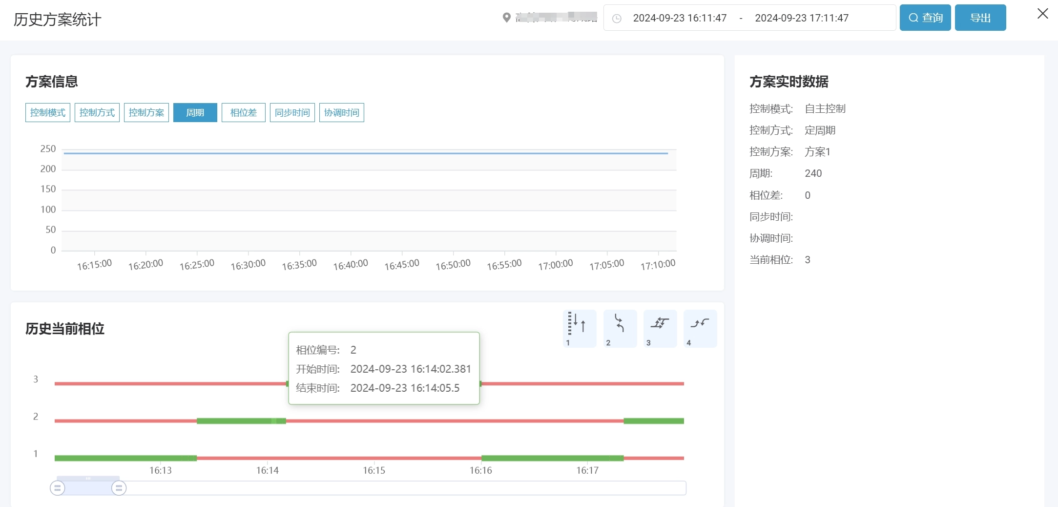 (2) 点击“操作-更多-历史方案统计”,选择具体时间,点击“查询”按钮,可查看方案信息(控制模式、控制方式、控制方案、周期、相位差、同步时间和协调时间)对应的趋势图,并展示历史当前相位,方案实时数据(控制模式、控制方式、控制方案、周期、相位差、同步时间、协调时间和当前相位)。点击“导出”按钮,可将数据以.xlsx格式导出。