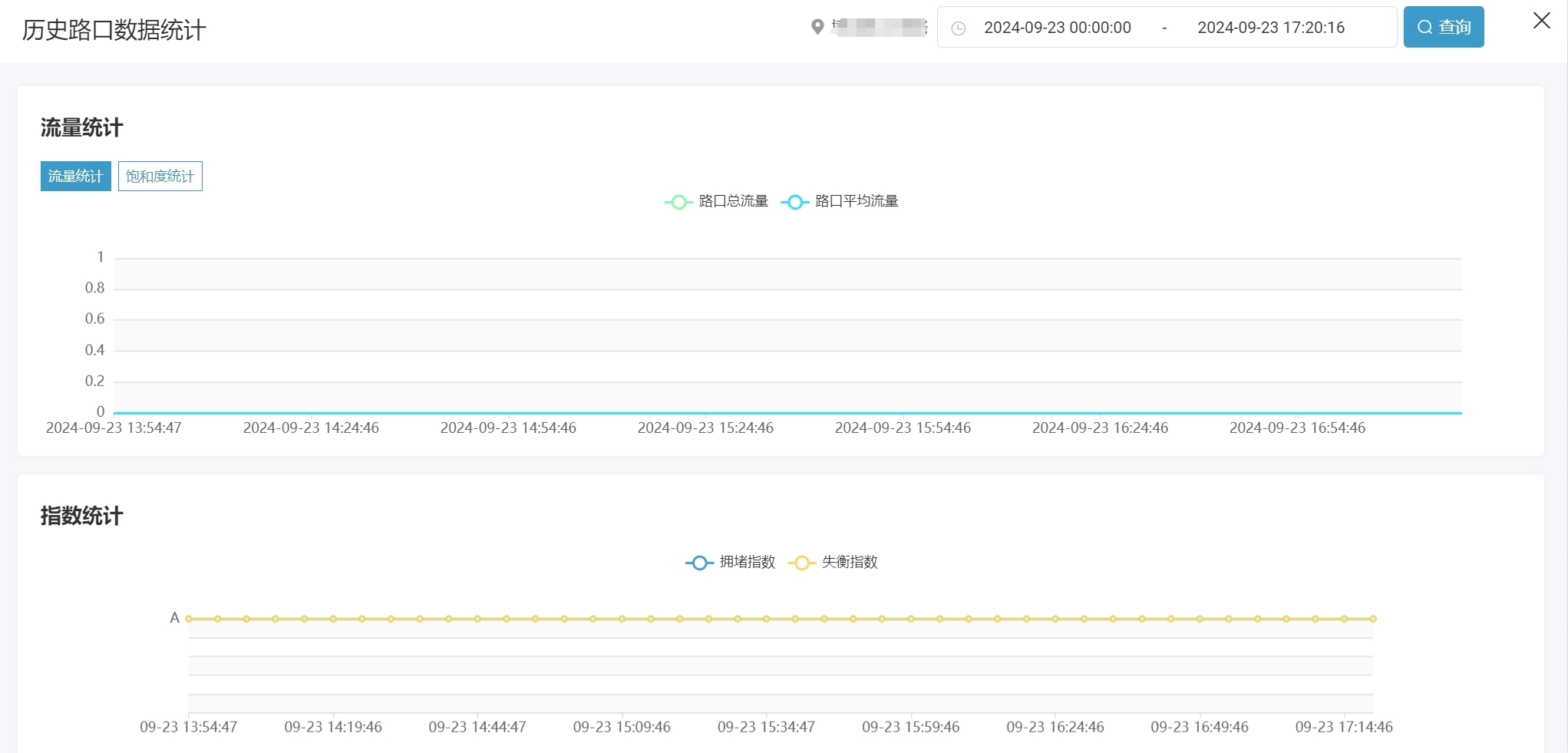 (3) 点击“操作-更多-历史路口数据统计”,选择具体时间,点击“查询”按钮,可查看流量统计(流量统计、饱和度统计)和指数统计对应的趋势图。