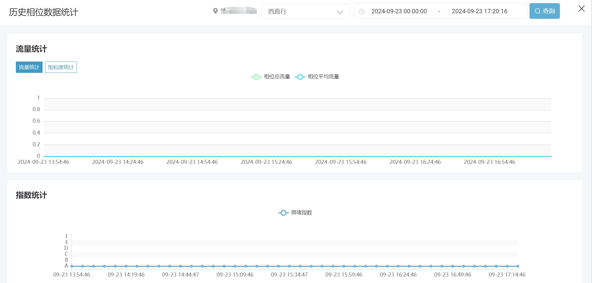 (4) 点击“操作-更多-历史相位数据统计”,选择具体相位和时间,点击“查询”按钮,可查看流量统计(流量统计、饱和度统计)和指数统计对应的趋势图。