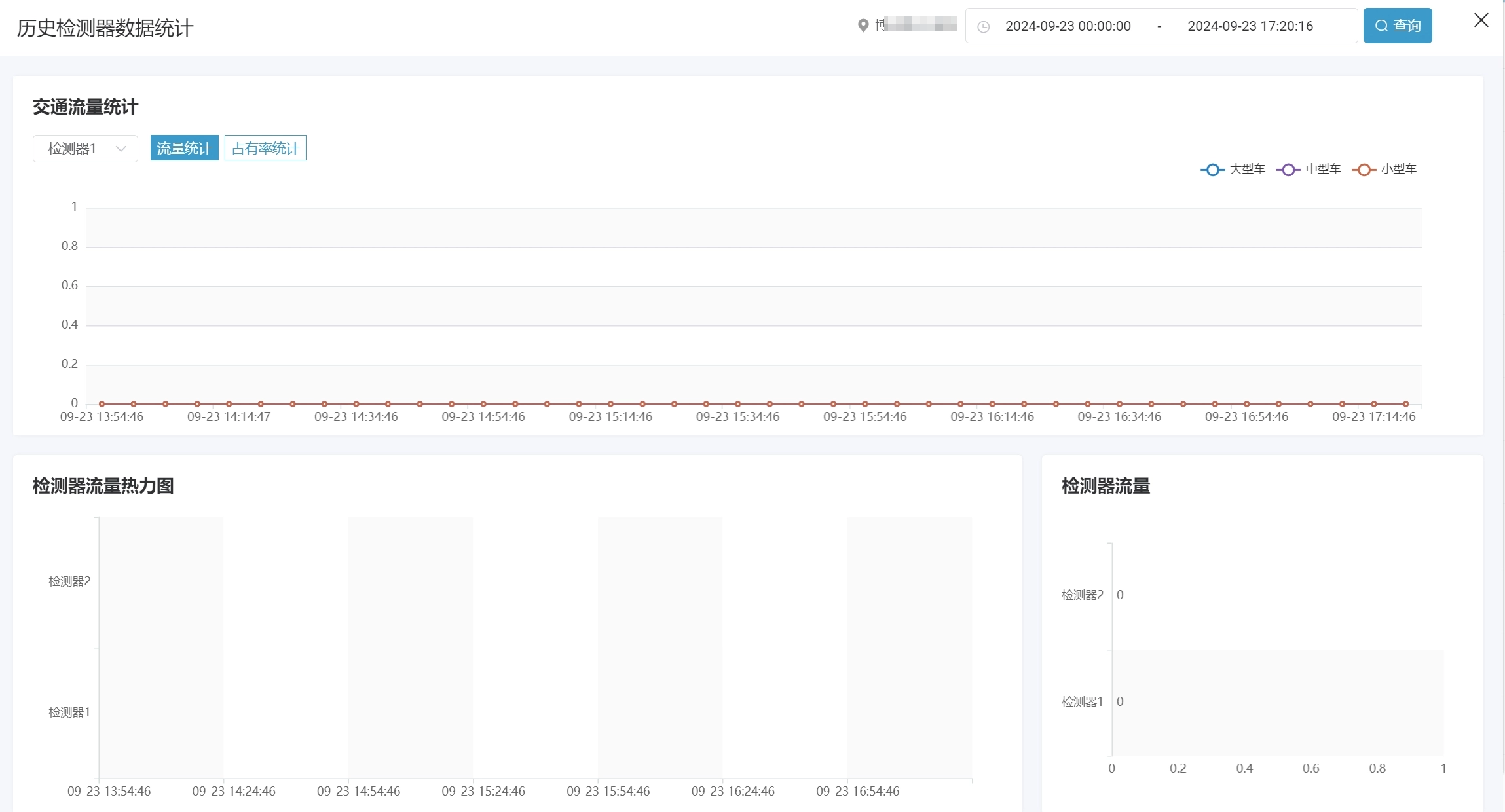 (5) 点击“操作-更多-历史检测器数据统计”,选择具体时间,点击“查询”按钮,可查看交通流量统计(流量统计、占有率统计)、检测器流量热力图和检测器流量。