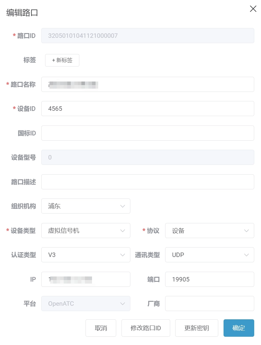 在路口管理主页面点击“编辑”按钮,弹出编辑路口对话框。填写完成路口各参数后,点击确认,列表中的数据变更为更改后的信息。