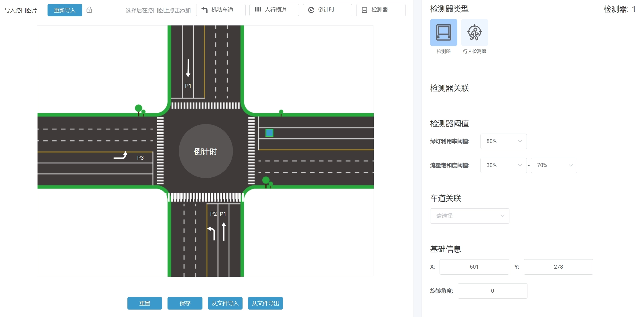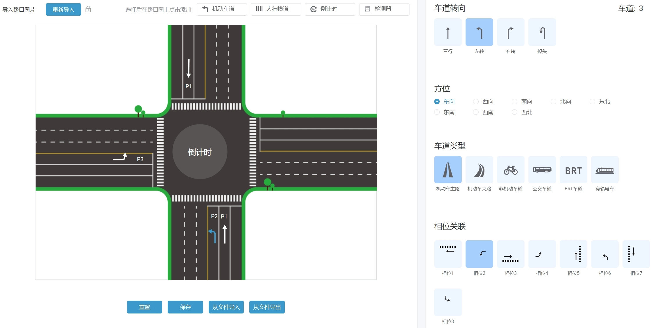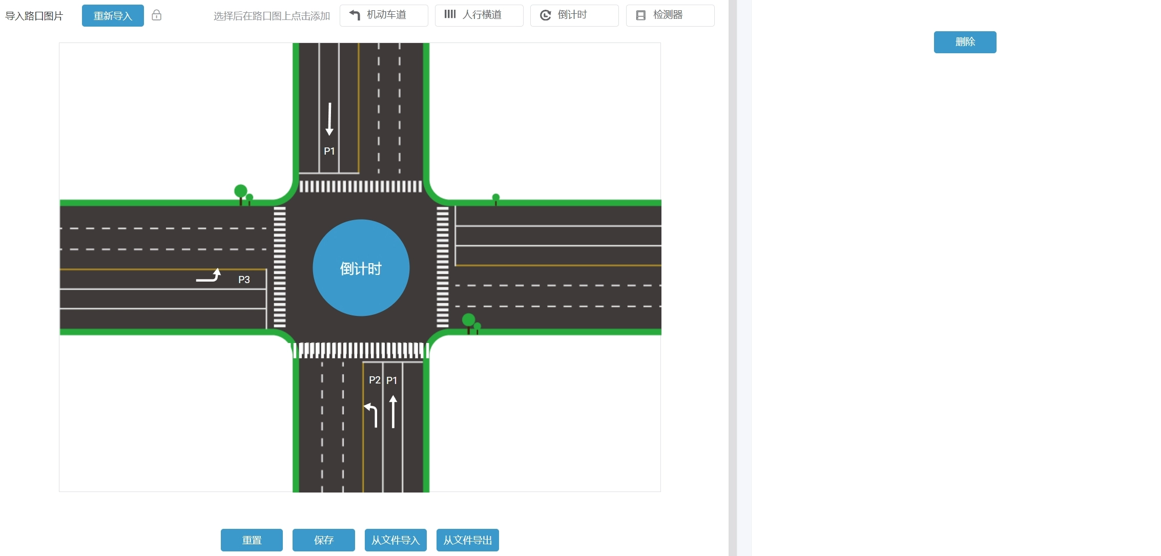 点击“从文件导入”按钮,选择本地的json格式配置文件,可直接导入相关配置。点击“从文件导出”按钮,可导出json格式配置文件至本地,之后可直接导入至其他路口的渠化配置。