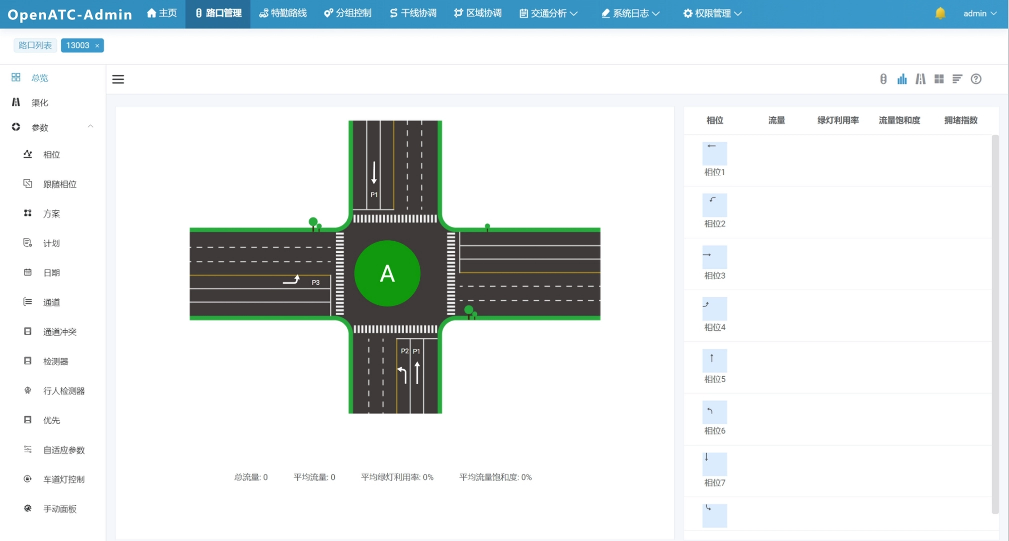 ,可查看该路口的流量统计,包括:总流量、平均流量、平均绿灯利用率、平均流量饱和度、各相位对应的流量、绿灯利用率、饱和度和拥堵指数等信息,如下图所示: