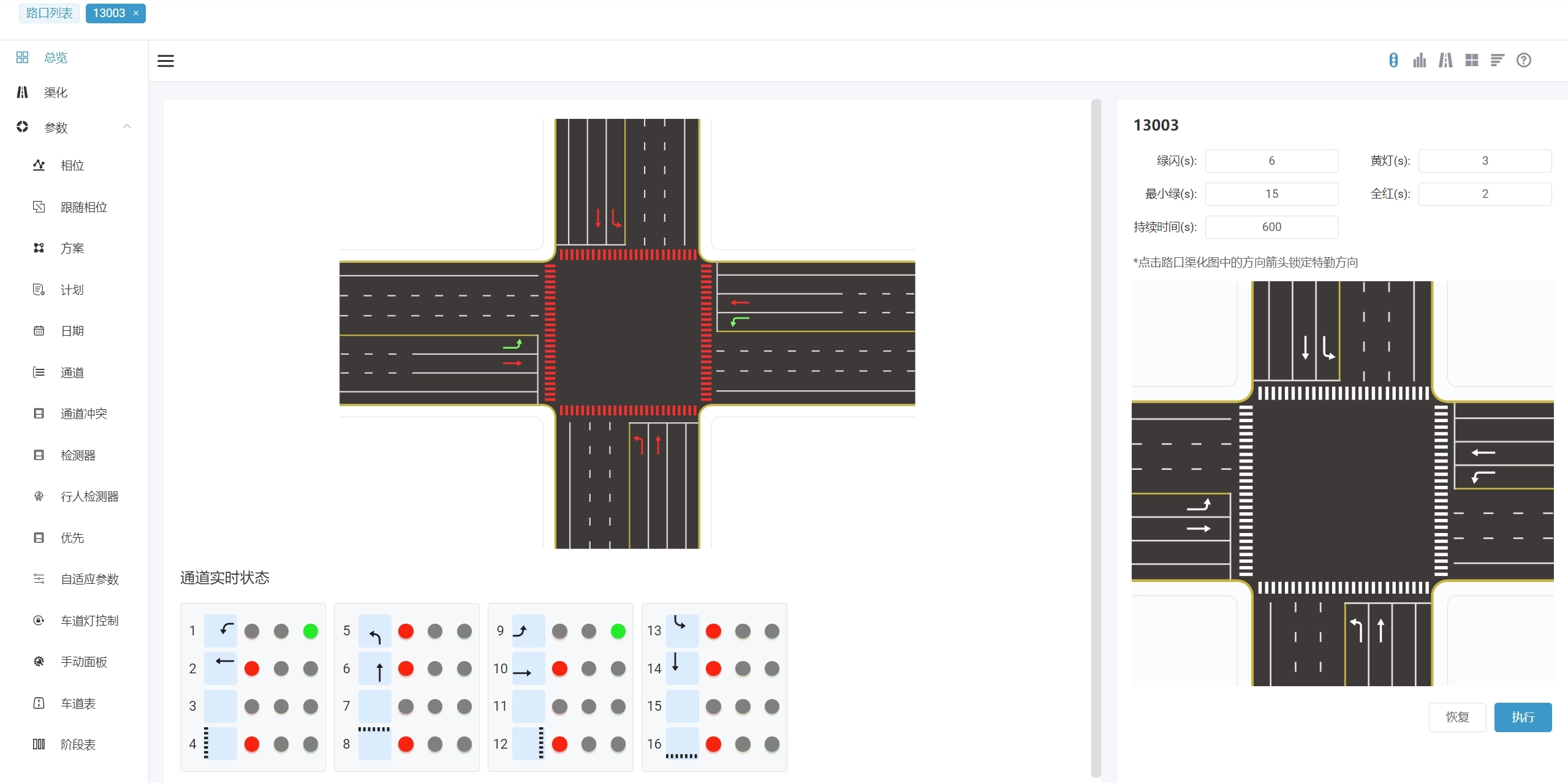 ,可直接替换为路口实际渠化界面,该界面可查看渠化配置信息,包括机动车道、人行横道、倒计时和检测器等,如下图所示: