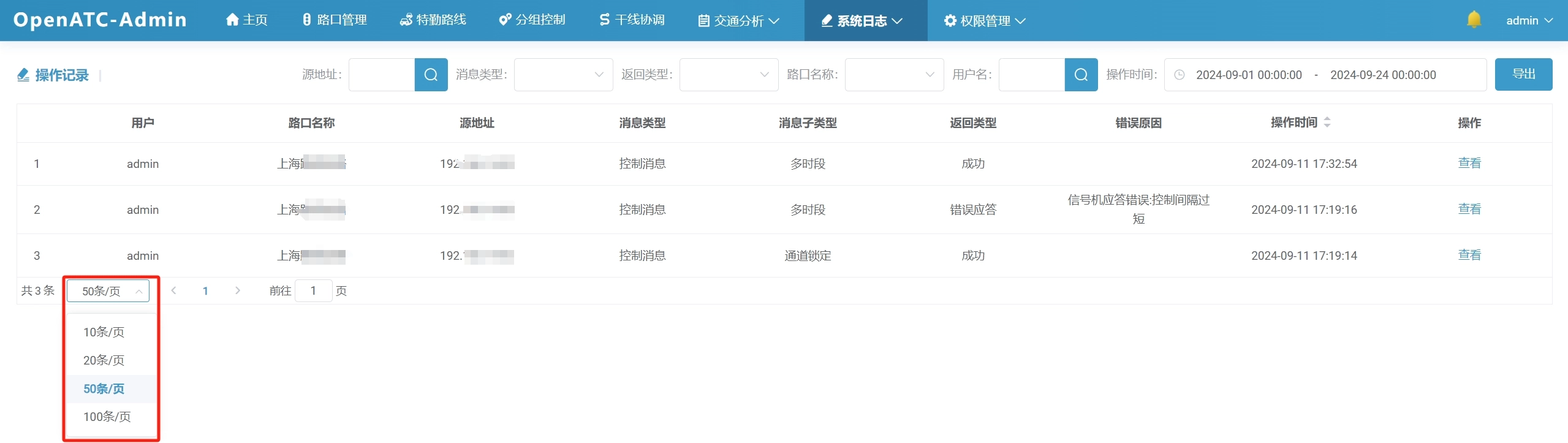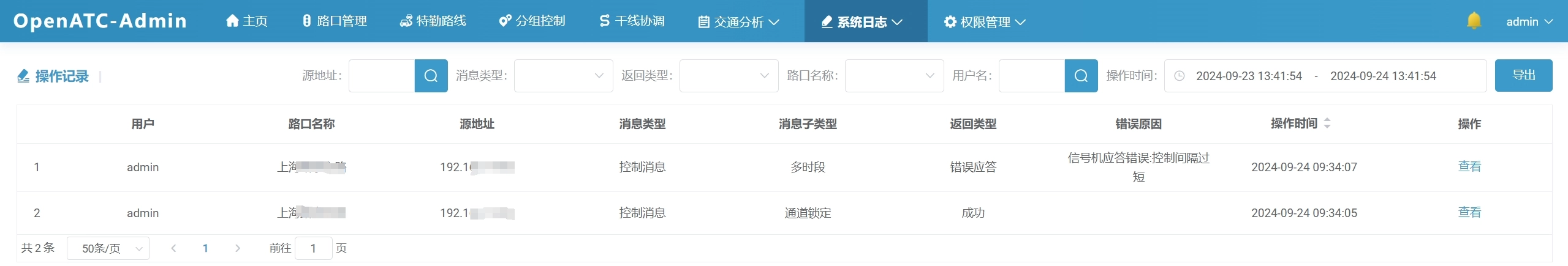 可根据筛选条件(源地址、消息类型、返回类型、路口名称、用户名和操作时间)进行查询。