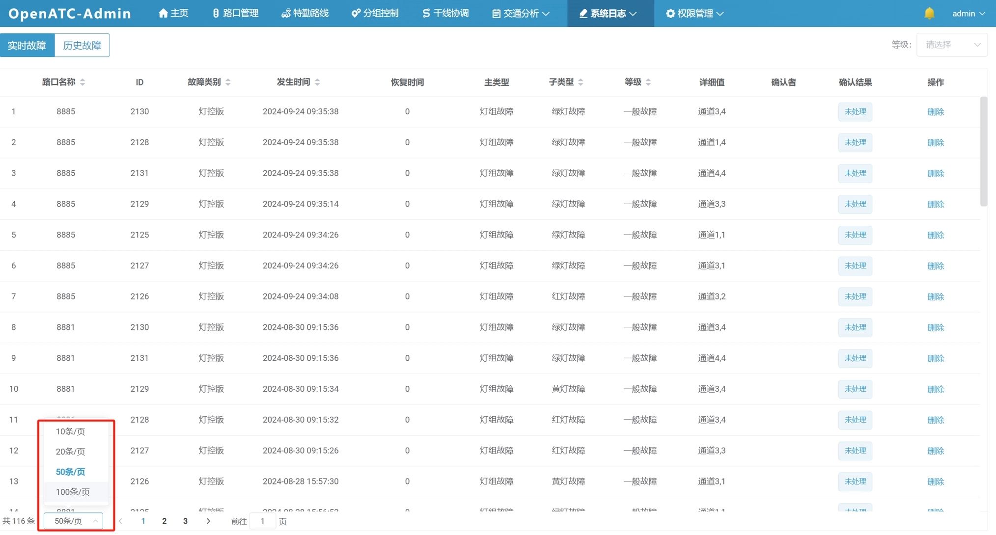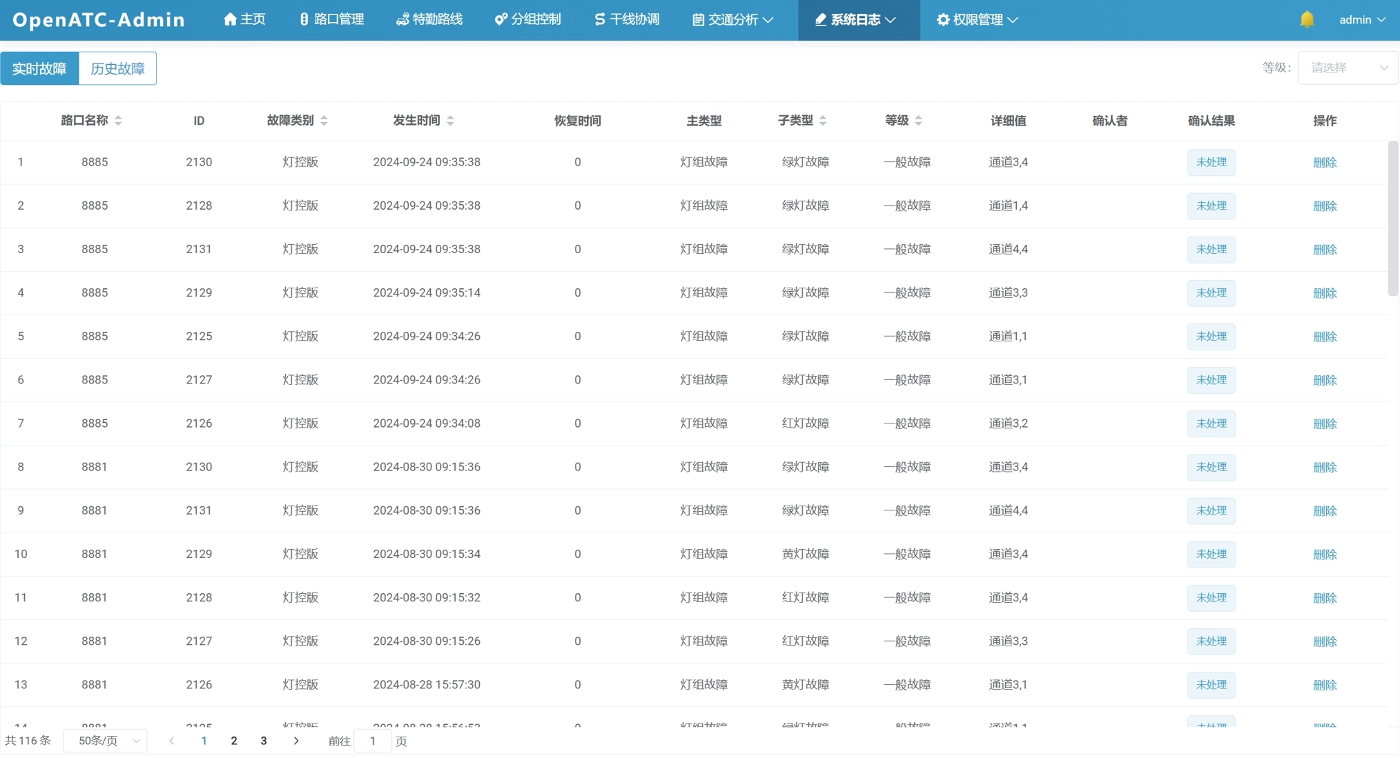 可以查看实时故障,界面信息包括:路口名称、ID、故障类别、发生时间、恢复时间、主类型、子类型、等级、详细值、确认者、确认结果(已忽略/已确认/未处理)等信息。