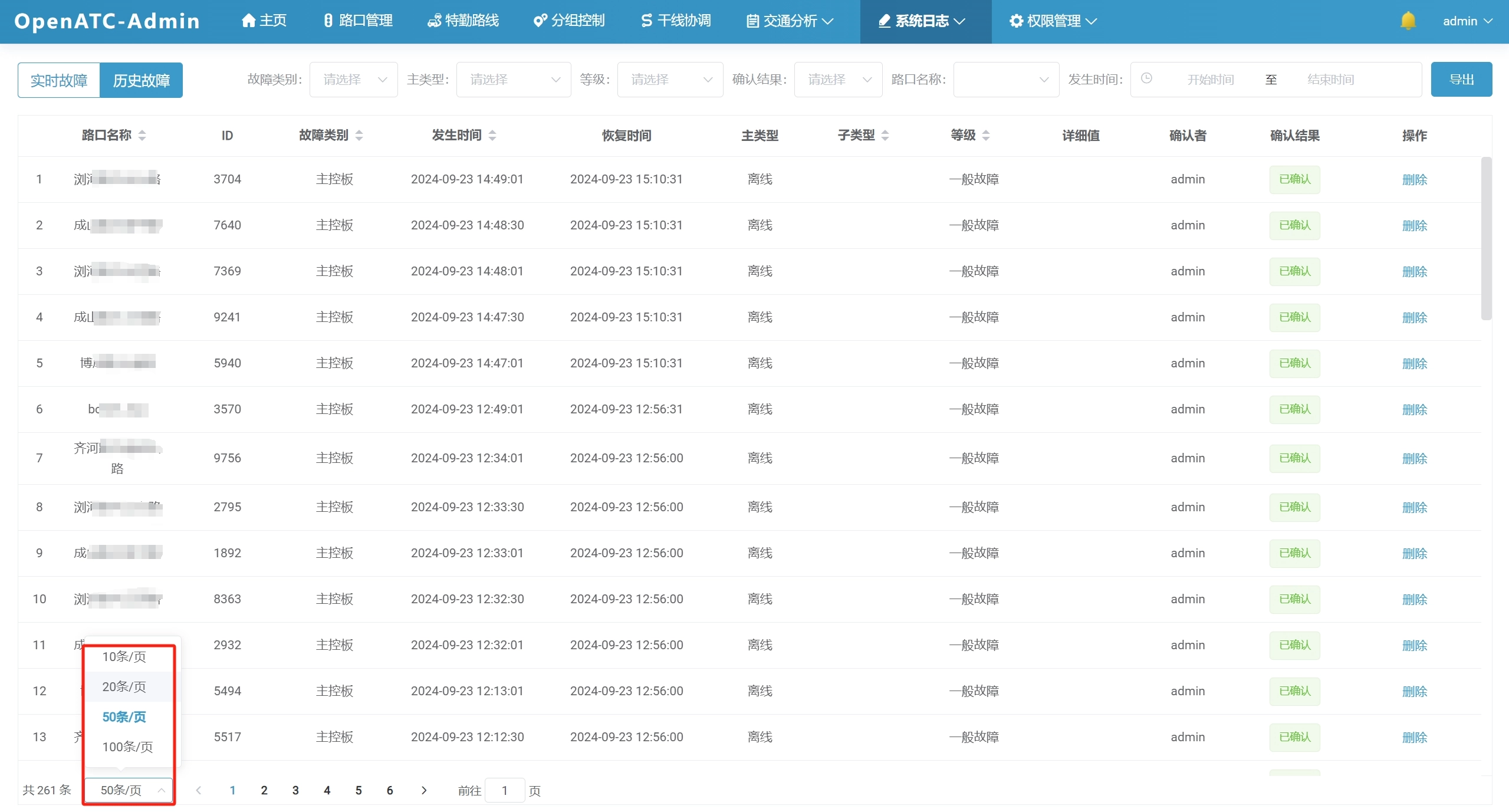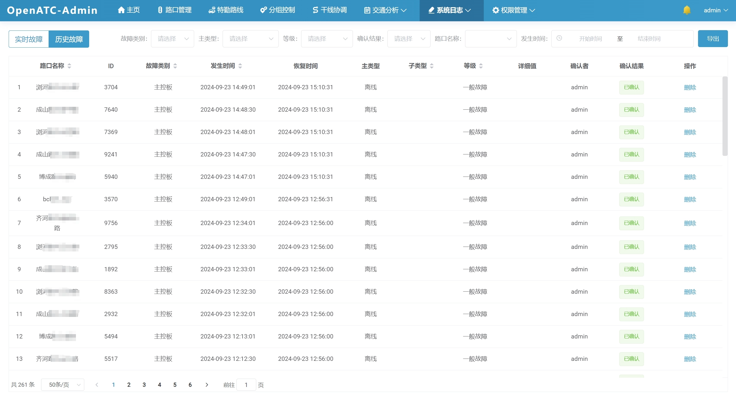 可以查看历史故障,界面信息包括:路口名称、ID、故障类别、发生时间、恢复时间、主类型、子类型、等级、详细值、确认者、确认结果(已忽略/已确认/未处理)等信息。