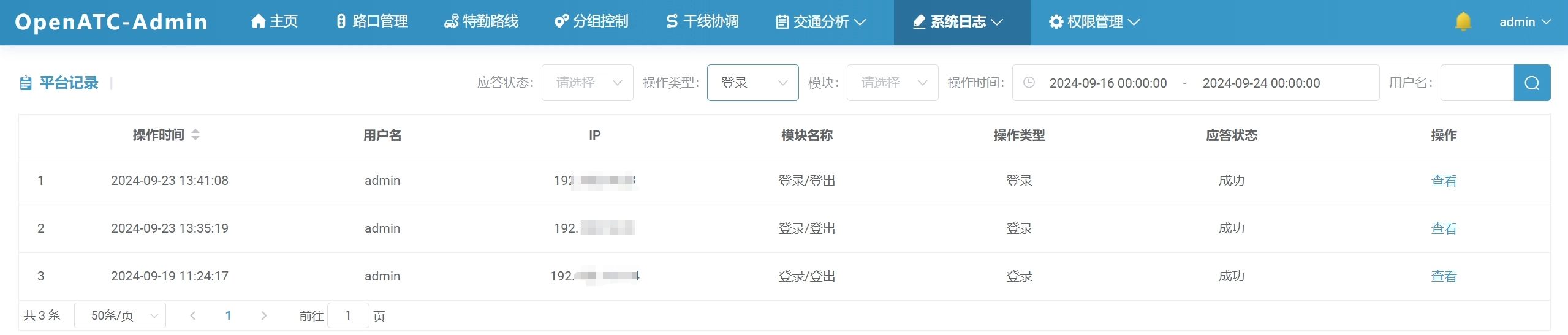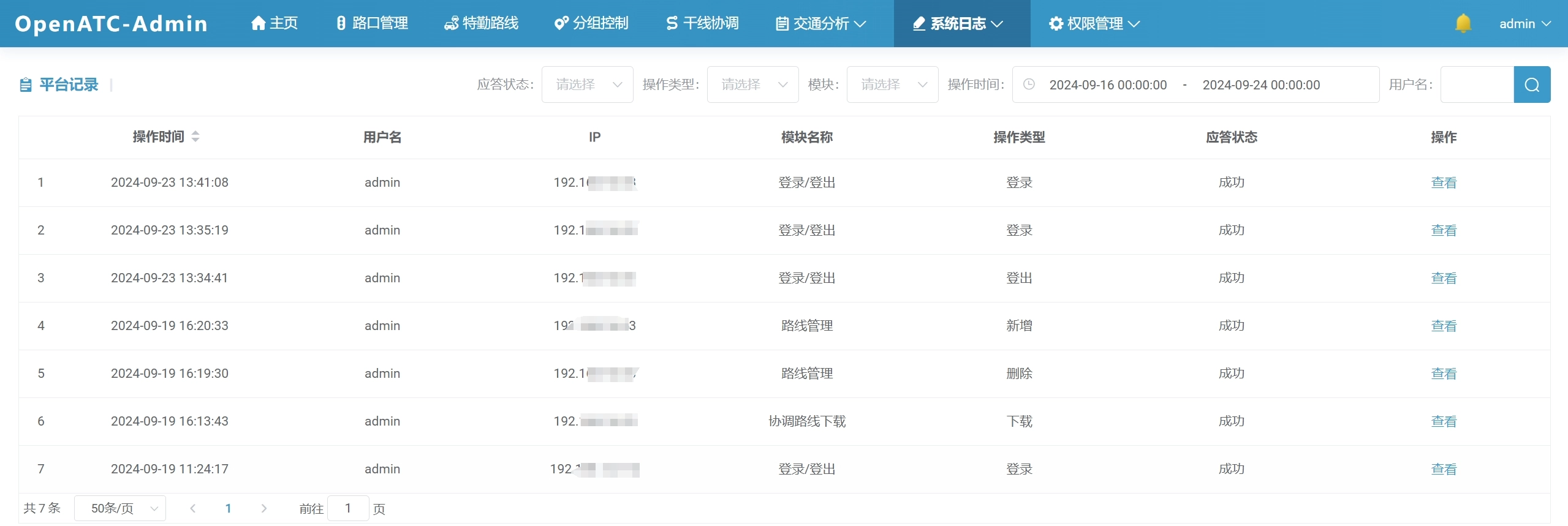 点击菜单栏“系统日志-操作记录”,进入相应界面,操作记录中记录所有用户对路口的操作情况,包括最近操作时间、操作的消息类型、以及信号机的应答等。